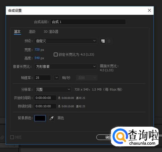 我以黑色为例,新建好之后,在主窗口就会看到一个黑色背景的合成,如图