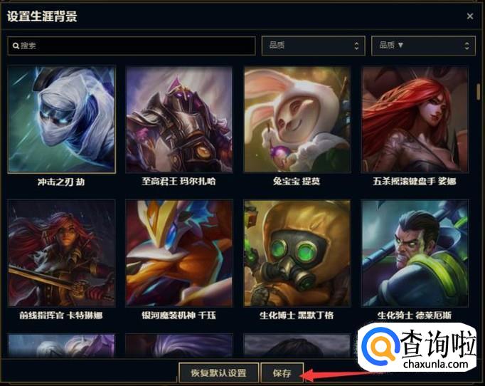 最后,在设置界面中选择自己喜欢的英雄或皮肤原画,点击保存即可更换: