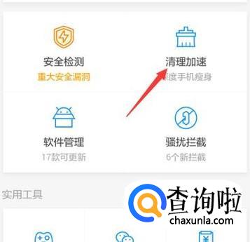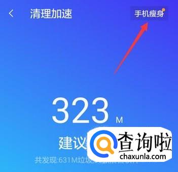 在打开的手机管家界面找到垃圾清理按钮,进入垃圾清理界面,然后再在弹出的界面的右上角找到手机瘦身的按钮,点击进入