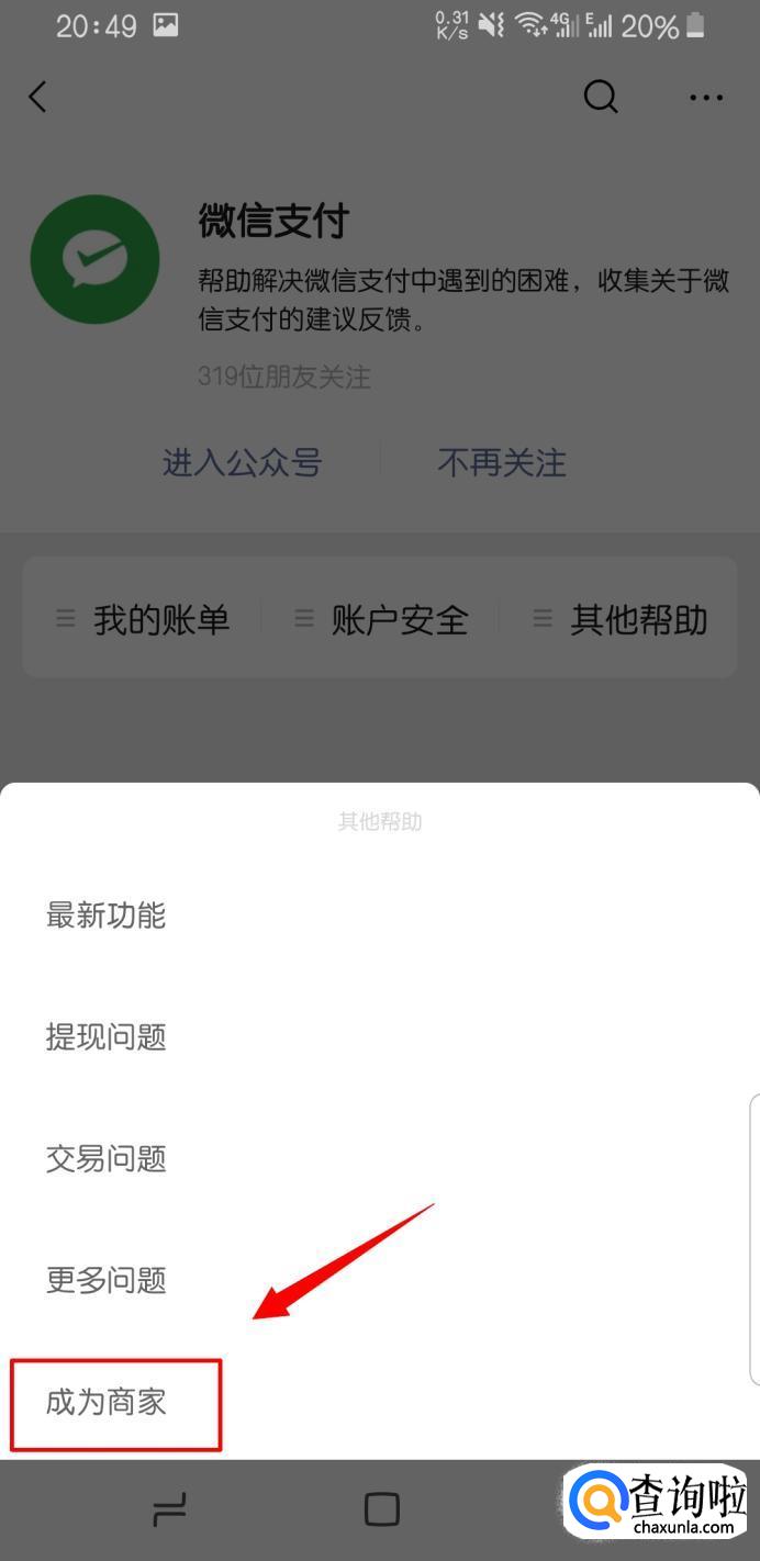 在“其他帮助”弹出的菜单中,点击“成为商家”。