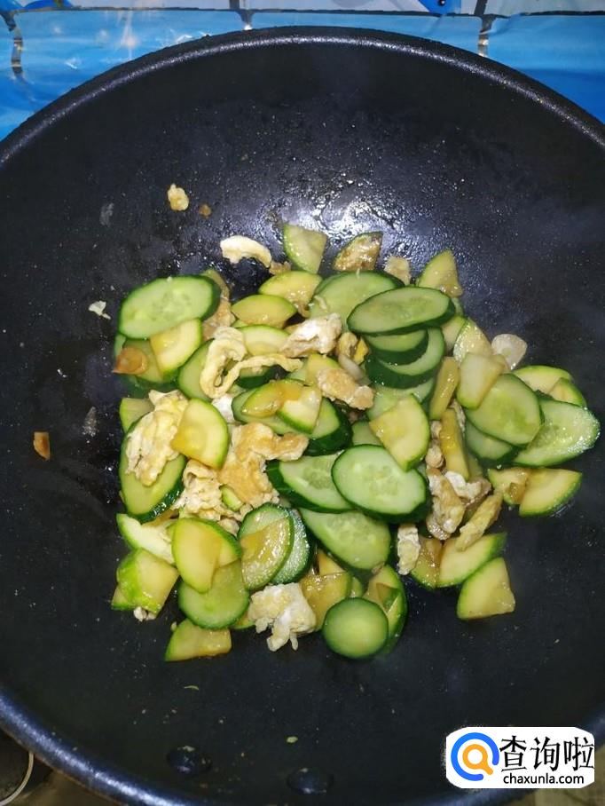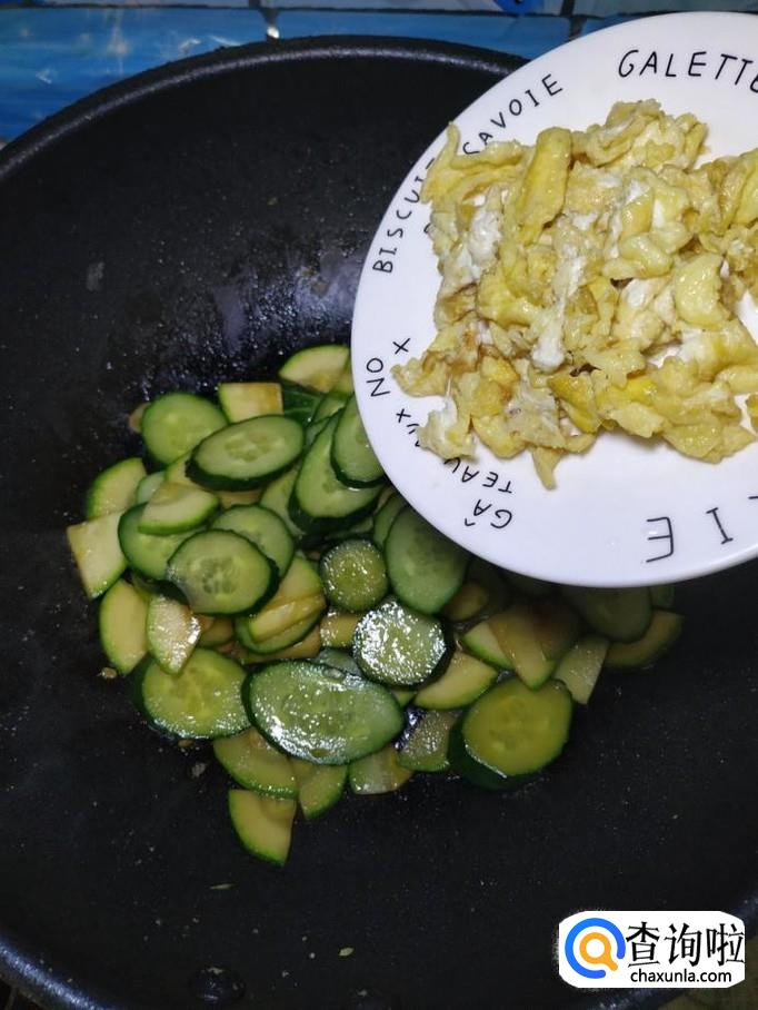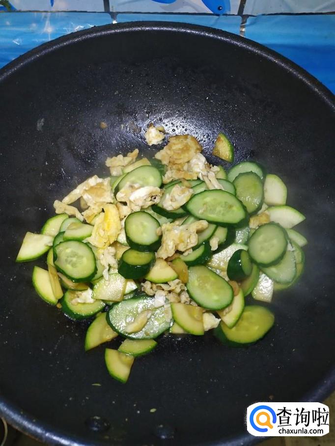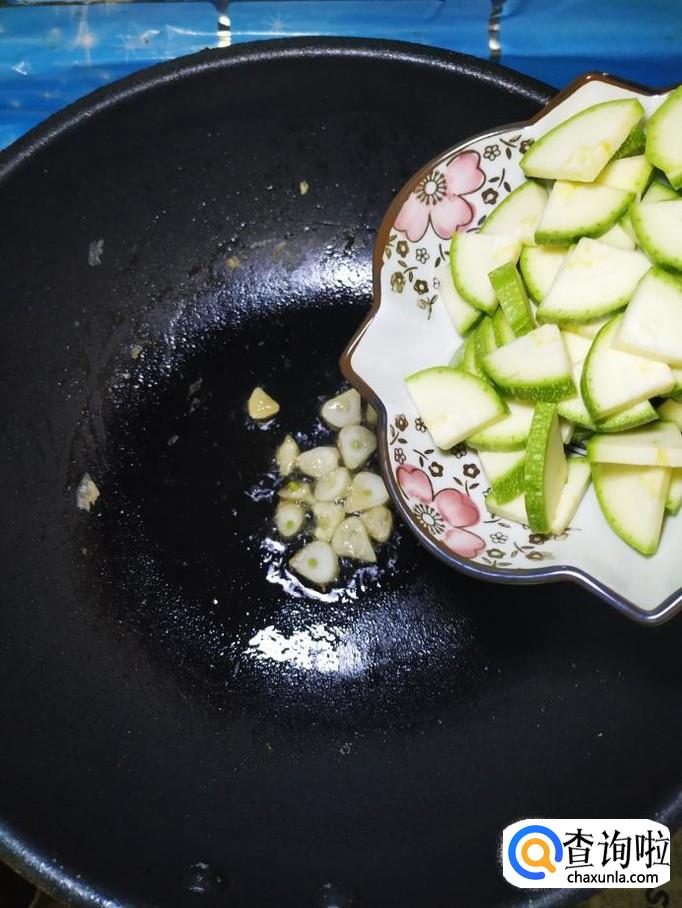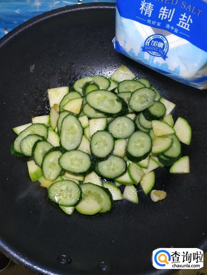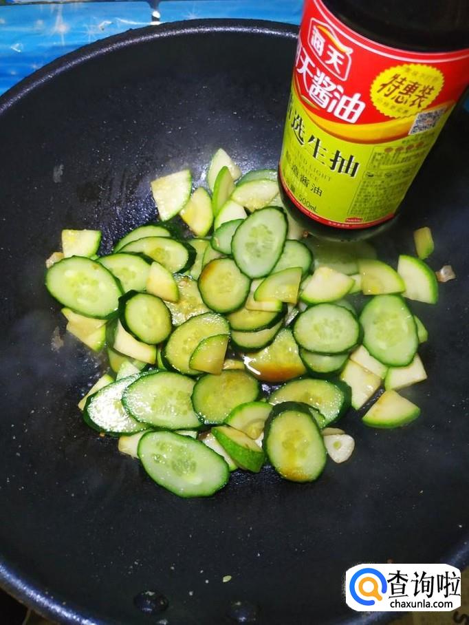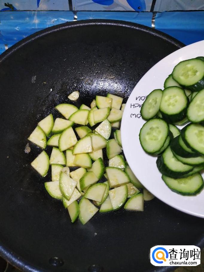 炒锅中再放入少许油,加入适量蒜片爆香,然后将西葫芦和黄瓜倒入锅中,翻炒均匀。
