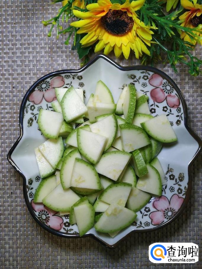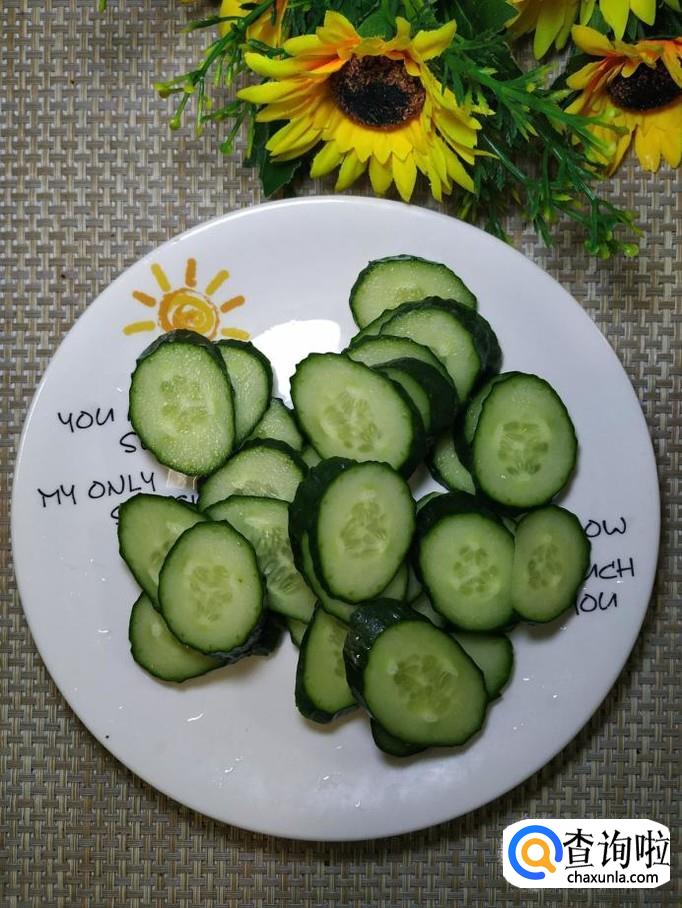 准备一根黄瓜,洗净后切成片,再准备适量的西葫芦,洗净后切片儿,分别放入盘中备用。