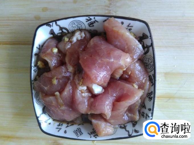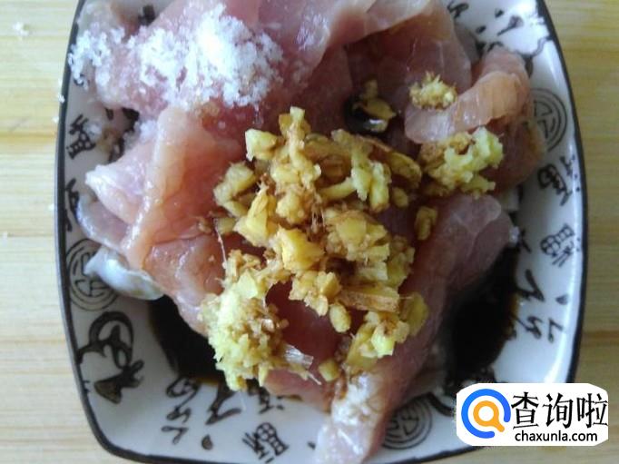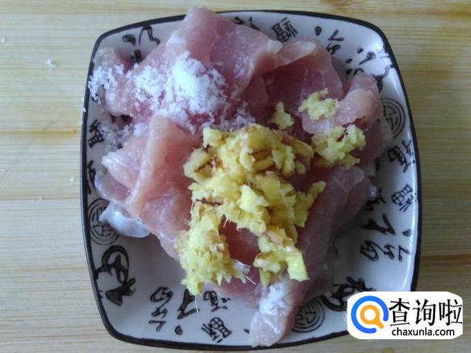 瘦肉切成片,加适量的盐、姜蓉、1勺生抽、1勺料酒腌制几分钟。