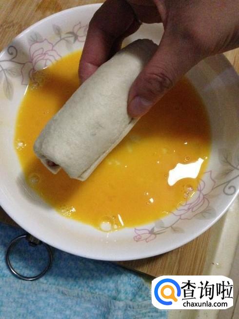 鸡蛋倒入碗中,把吐司卷放入沾满蛋液