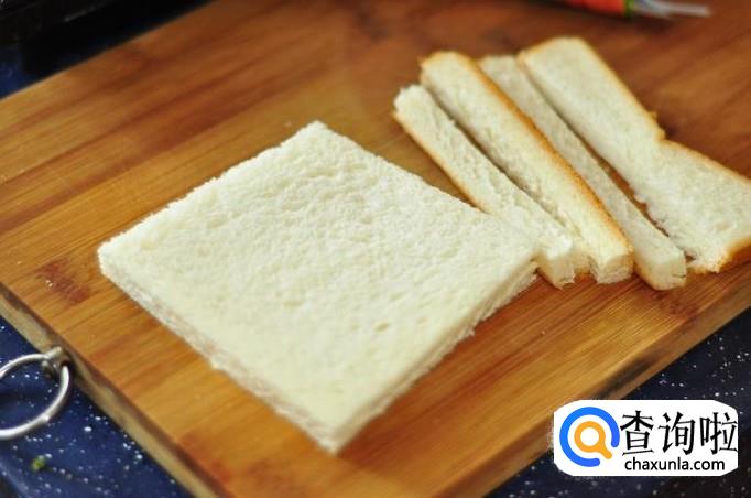 取2片吐司,把吐司边切掉,用擀面杖把它压扁
