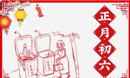 正月初六,商店酒楼才正式开张营业,而且要大放鞭炮,不亚于除夕的境况。传说这一天最受欢迎的是当年满12岁的男孩,因为12是6的二倍,这叫六六大顺。这一天,每家每户要把节日积存的垃圾扔出去,这叫送穷鬼。