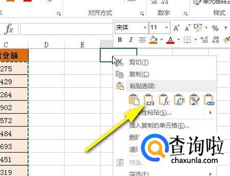 紧接着,鼠标在F1单元格这里点击一下,再右击,弹出一列菜单,在“粘贴选项”下面的图标中点击“123”这个图标,如下图所示。
