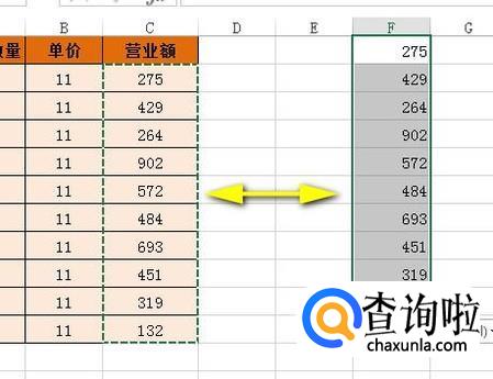 接下来,要把C2:C11这区域单元格的数据复制到F1:F10这区域单元格中。