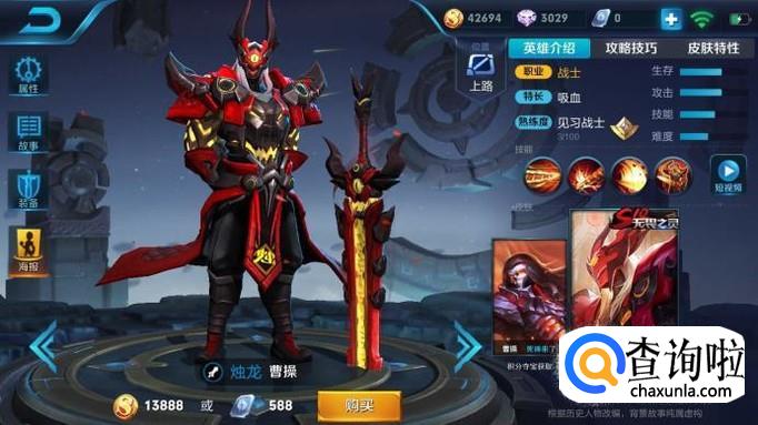 我们也可以提前对英雄穿戴的皮肤做更改,去英雄界面点击英雄,然后滑动皮肤,点击穿戴就好了,S10,是我们的上单,吸血很强大的曹操。