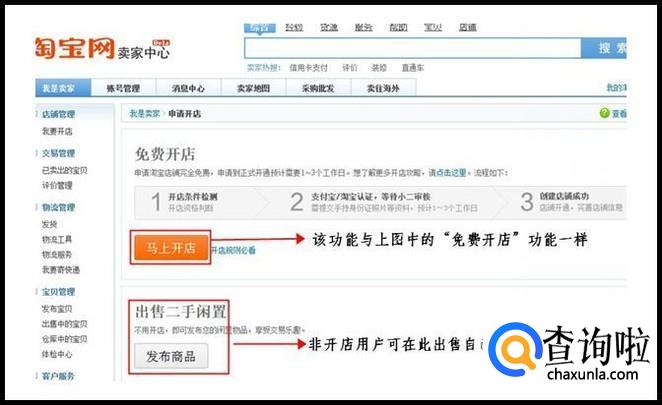 如您是点击"卖家中心"的,进入页面后,可点击左侧导航条的"我要开店"或右侧导航条的"马上开店",如下图。