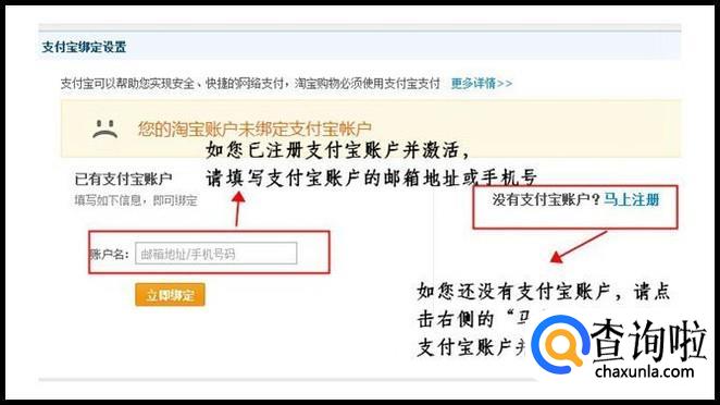 未绑定支付宝账户的状态下,点击"绑定"后,页面会跳转至【账户管理】-【支付宝绑定设置】页面,此时,您可以将注册好的支付宝账户进行绑定,如下图提示操作。