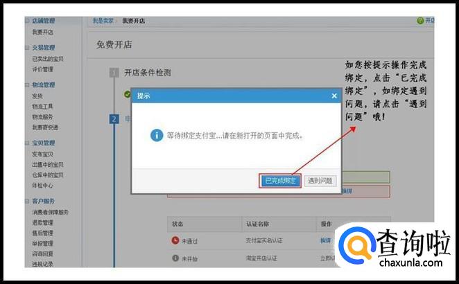 绑定成功后,您需要继续开店的一系列操作,请返回"卖家中心"淘宝开店页面,在页面浮出的窗口中点击"已完成绑定"。