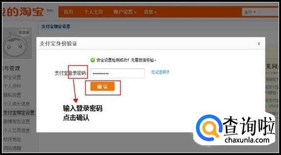 输入支付宝账户名后,点击"立即绑定",之后请根据如下页面提示,输入支付宝登陆密码后点击"确认"。