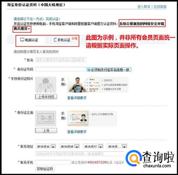 点击【立即认证】后,进入【淘宝身份认证资料】页面,请根据页面提示进行操作(系统会根据您的网络安全作出推荐),如图。