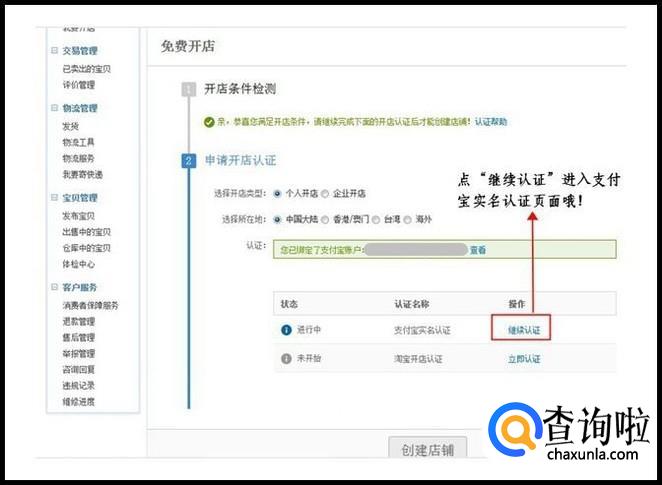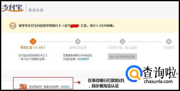 进行中的支付宝实名认证如需继续完成的,请在支付宝向您银行卡打款的1-2天之后进入淘宝开店页面继续支付宝实名认证的操作,如下图。