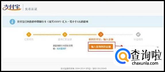 点击"继续认证"后,进入支付宝银行卡打款信息页面,请您将银行卡中查询到的支付宝打款金额准确输入以下图示中的信息项,并按以下页面提示操作。