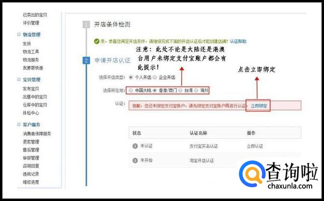 如您是在首页直接点击了"免费开店",进入申请页面后系统首先会检测您是否满足开店条件,如您满足条件,则可继续申请,选择您开店的类型,如您是个人用户开店(指非公司性质的开店用户),在您淘宝账户未绑定淘宝账户时,系统会提示您去绑定支付宝账户,如下图所示,您需点击"立即绑定"。