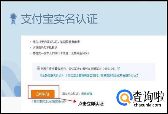在支付宝实名认证的条件项,点击"继续认证"后,会进入"支付宝实名认证"页面,请按下图提示,点击"立即认证"。