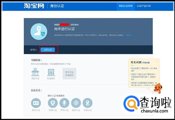 点击【立即认证】后,您会进入【淘宝网身份认证】的页面,请点击该页面中的【立即认证】,如图所示。