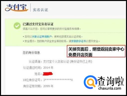 输入正确金额后,系统确认完成,支付宝实名认证即也完成,请关掉页面后,继续返回淘宝卖家中心免费开店页面。