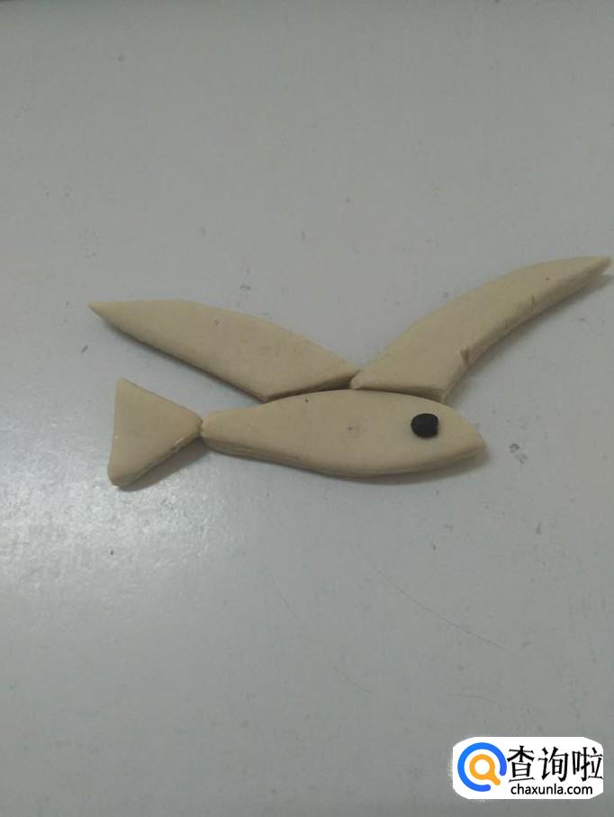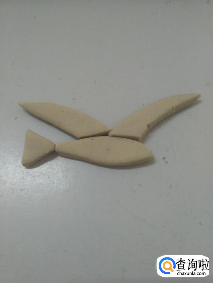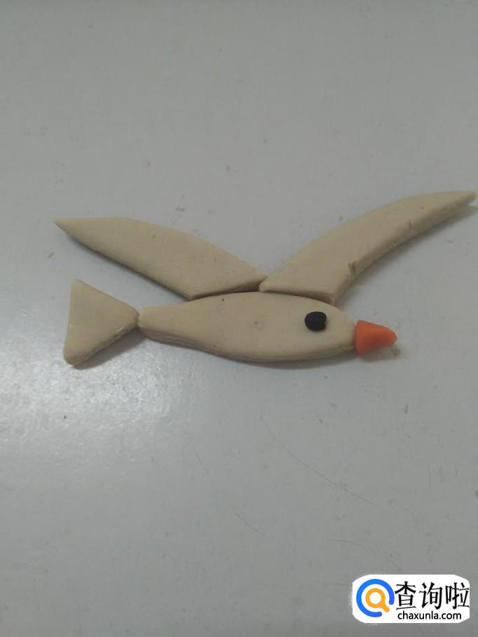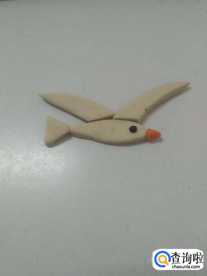 再用白色捏两个三角形,尖端稍微弯一下,粘在海鸥身体上方,当作两只翅膀。