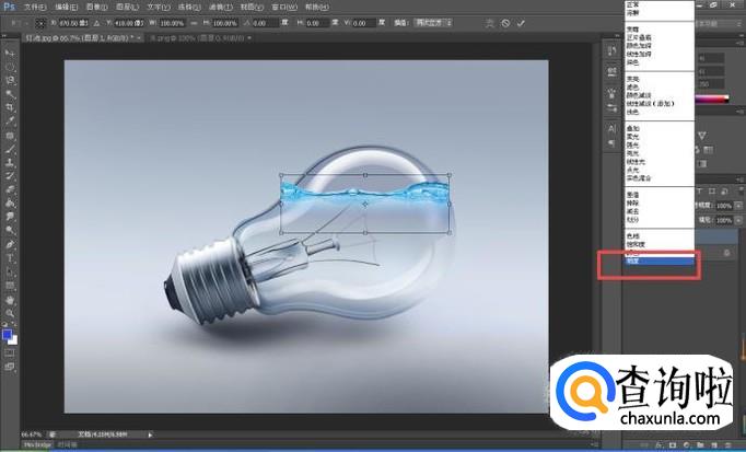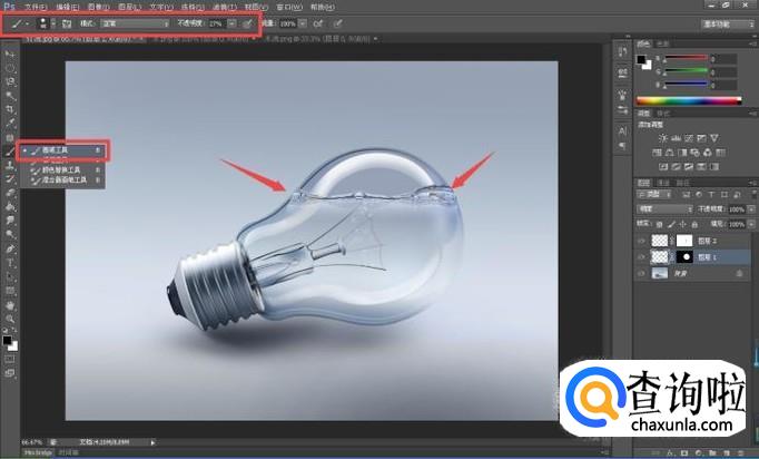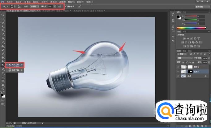 接着在工具栏中选用“减淡工具”,设置参数之后,对画面中灯泡和水交叉重叠的位置进行适当的修整;