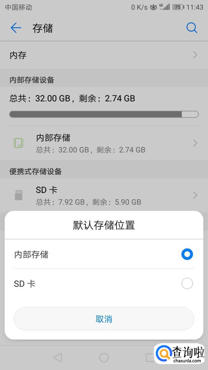 进入“存储”页面找到“存储设置”,然后把默认存储位置变更为SD卡。