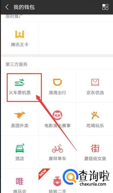 进入到钱包页面,找到“火车票机票”,点击并进入,如图所示。