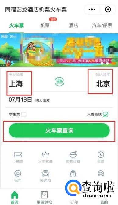 输入起始点、出发日期,勾选高铁动车,然后点击火车票查询即可,如图所示。