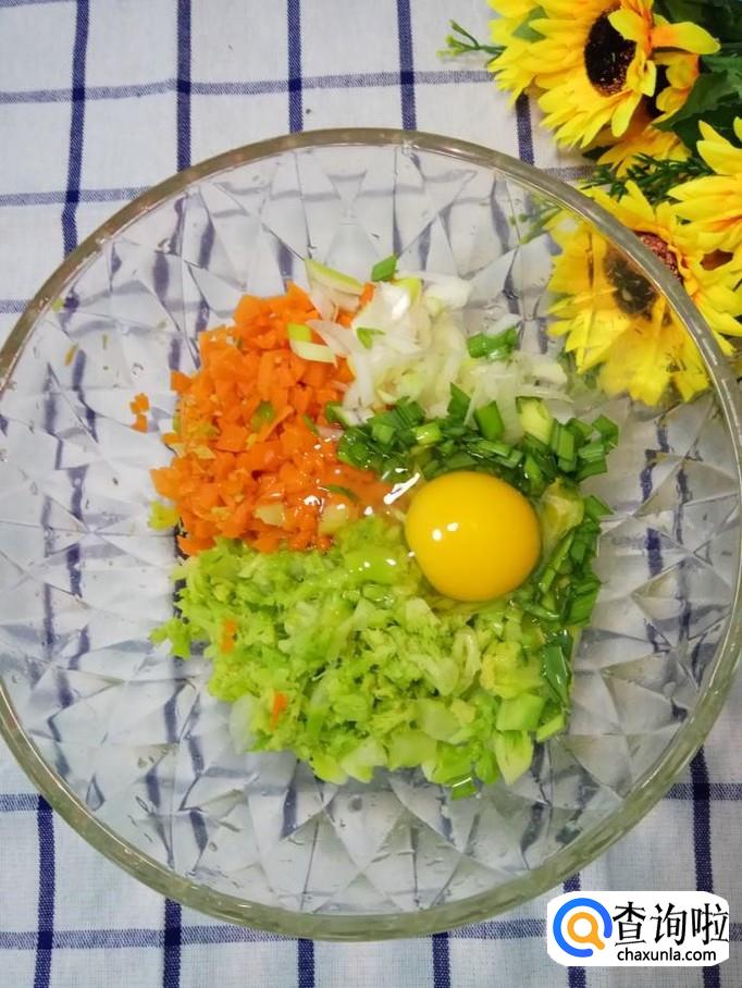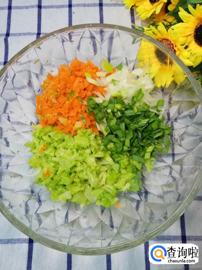 将蒜苗和葱切碎,再将焯好水的西兰花和胡萝卜切碎,放在一起。