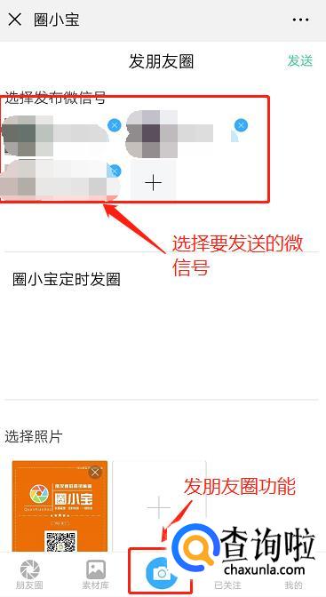 可以安排多个微信号定时发送,首先选择要发送的微信号,然后编辑好朋友圈内容。