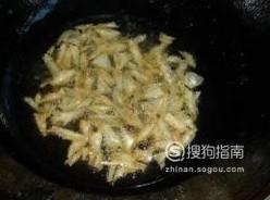 起一口锅烧油,油多一点,油热后倒入鱼鳞小火进行炸制。