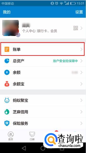 手机打开支付宝进入后,找到”账单“一项,然后点击进入。