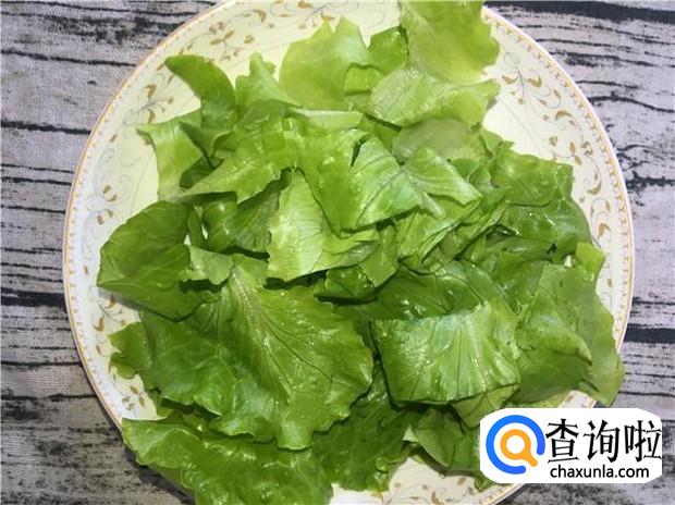 瘦肉清洗干净,切成薄片;生菜清洗干净,沥干水分,切成丝状。备用。