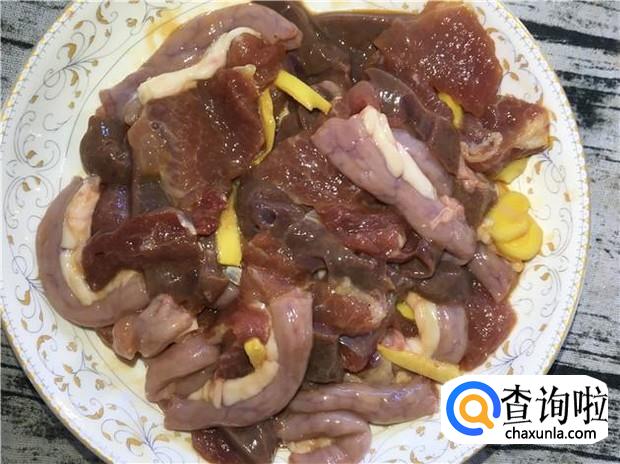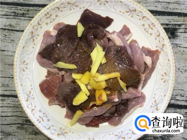 把猪肝、粉肠、瘦肉、姜皮,一起放入碟子中,加入适量的花生油、酱油、料酒、盐,搅拌均匀,腌制一会。