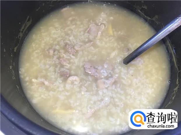 电饭锅中提前把白粥煮好,可以晚上定时煮好,这样早上就可以直接煮肉了。把腌制好的粉肠瘦肉倒入锅中,搅拌均匀,再次煮一遍。