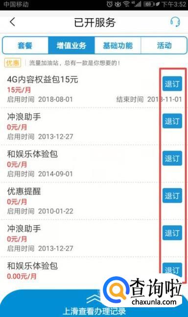 然后我们就可以看到很多我们可以退订的业务了,我们点击退订进行退订就可以了。