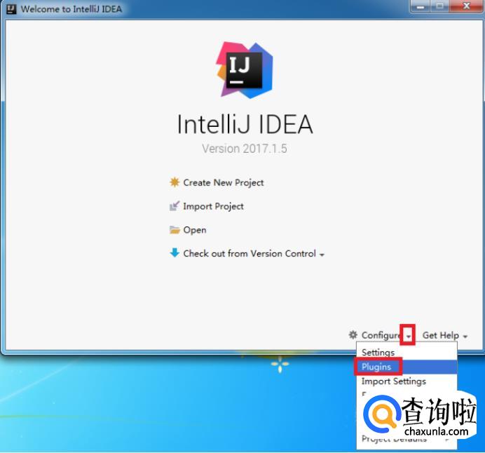 第一次运行,会出现欢迎界面,单击欢迎界面中的configure(配置),选中弹出菜单中的Plugins(插件),如下图所示。