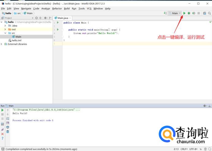 最后我们便可以在软件里面进行代码的编译,点击图中箭头所指的按钮即可运行测试。