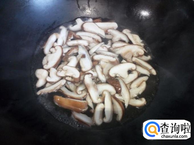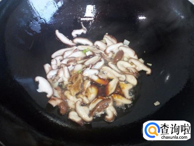 锅里放入油加热,油热后放入葱,姜,蒜,爆锅。放入香菇翻炒,放入五香粉,放入一小匙儿蚝油。