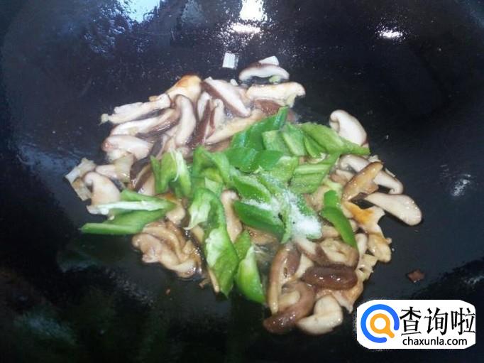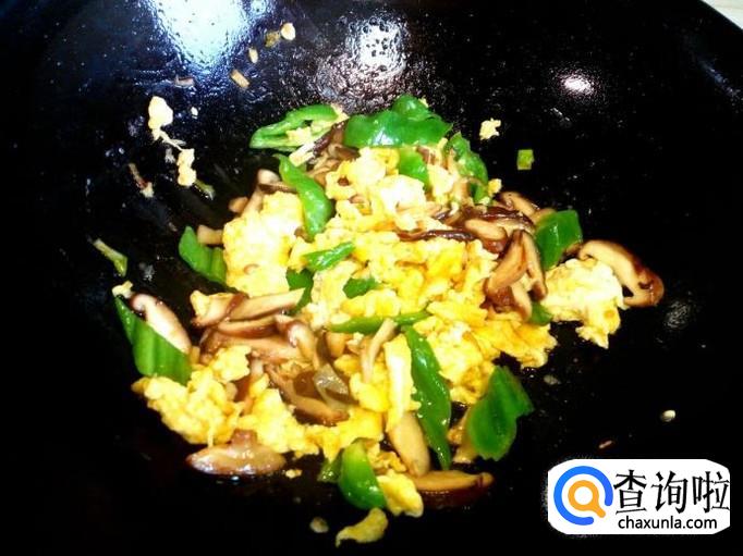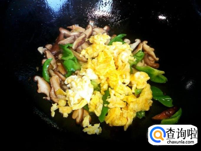 香菇略翻炒一下,放入青椒翻炒,放入盐。炒至青椒断生,放入炒好的鸡蛋。