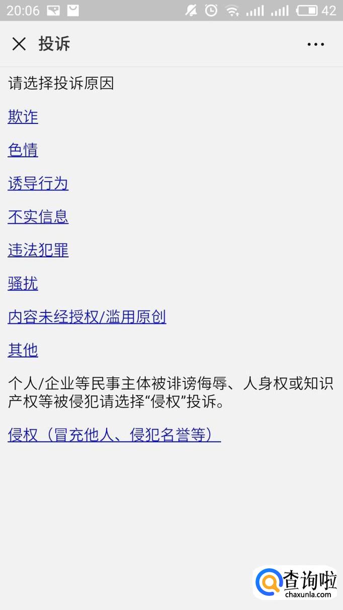 如下图所示,你可以根据你需要投诉的具体原因,在下图的蓝色部分选择对应的文字即可。