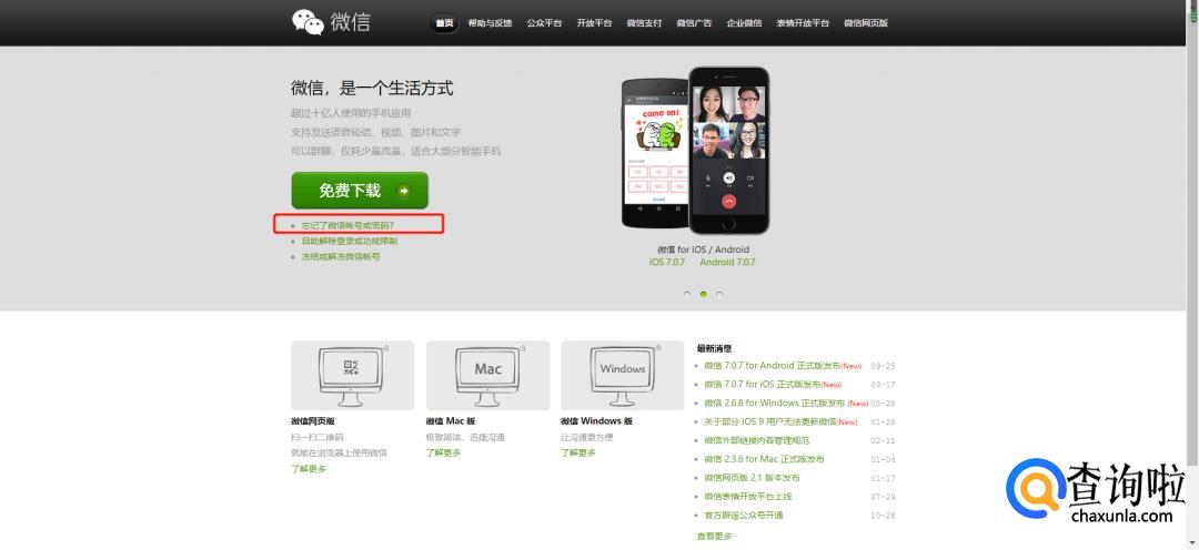 在电脑端打开【weixin.qq.com】即微信官网,进入后在页面的左边有个【忘了微信帐号或密码】,点击进入,如图所示。