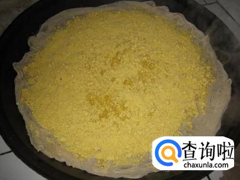 把搓好的糕面碎粒,放入铺有笼布的蒸笼上,大火隔水蒸上20分钟蒸熟。