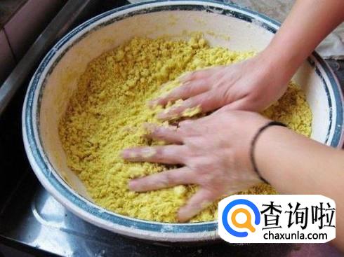 然后把蒸熟的糕面倒入盆里,蘸凉水和匀成面团,这样糕面就和好了。