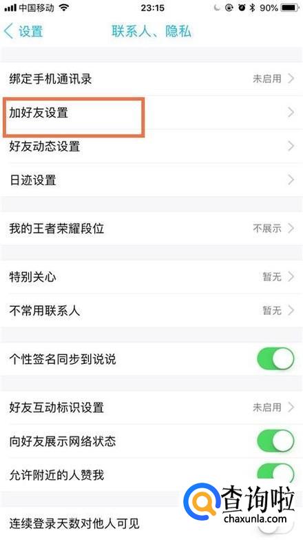 接着点击加好友设置,如下图所示。