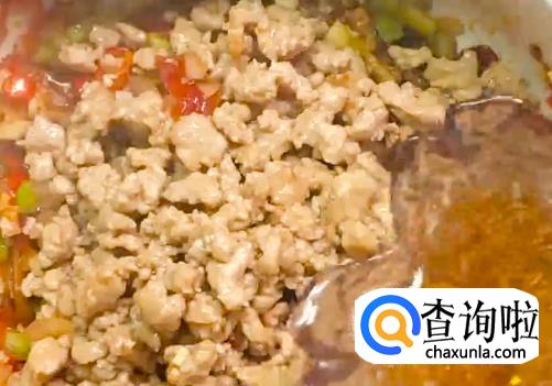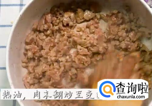 将腌制好的肉末下油锅翻炒,熟了之后捞出盛盘待用。