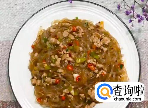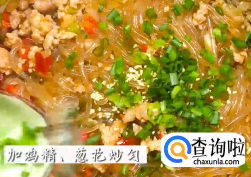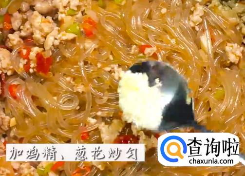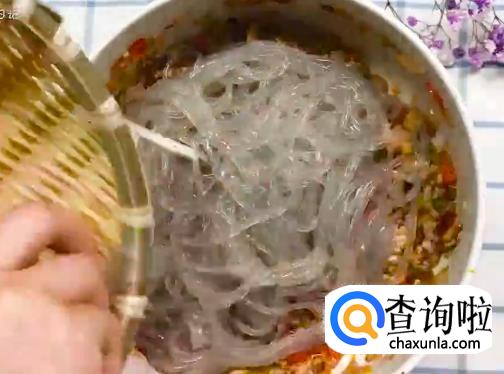 将肉末倒入炒料,加少量料酒,倒入煮好的粉丝进行翻炒。