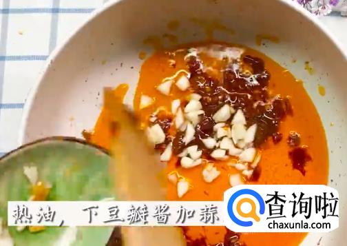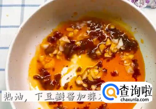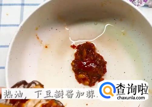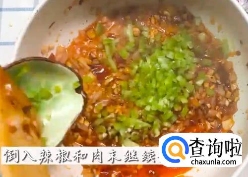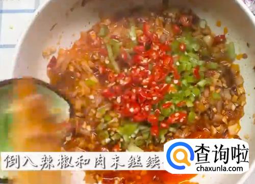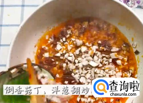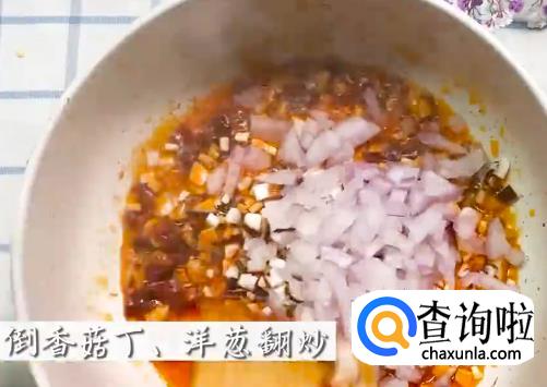 依次将豆瓣酱,香菇碎,洋葱碎,青椒,小米辣下锅炒料。