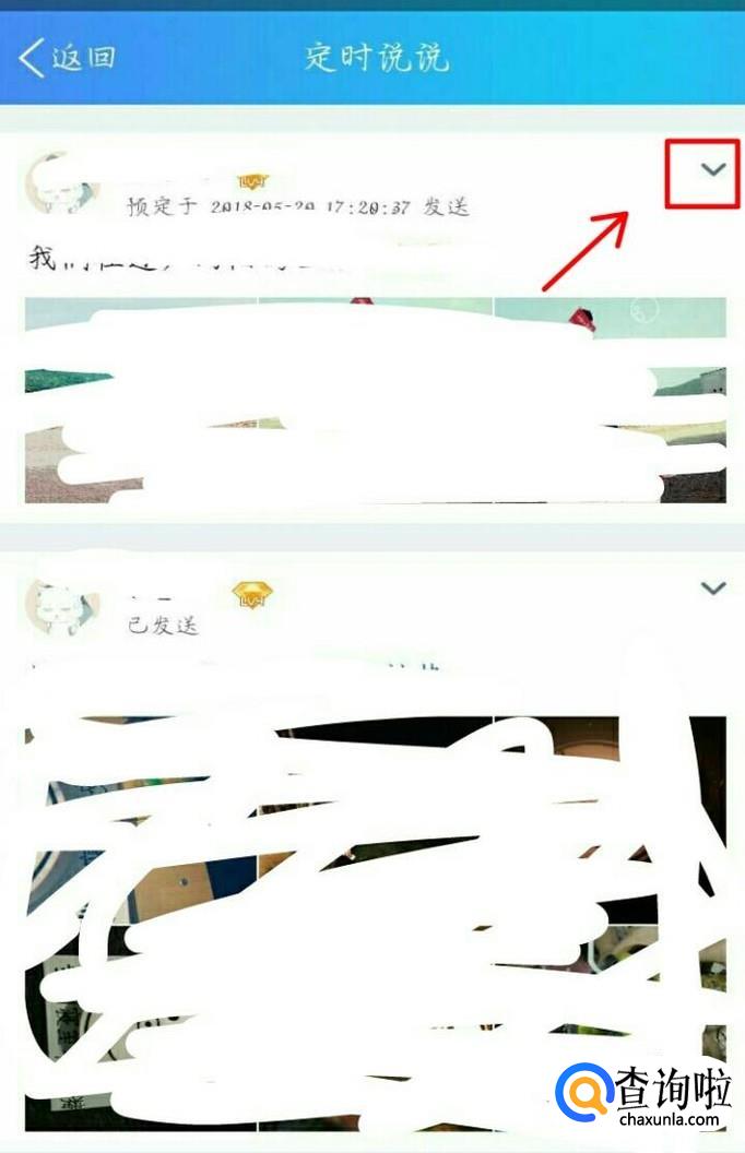 我们在这个定时说说中,找到我们需要删除的定时说说,点击它右边第一个三角形符号,如图所示。